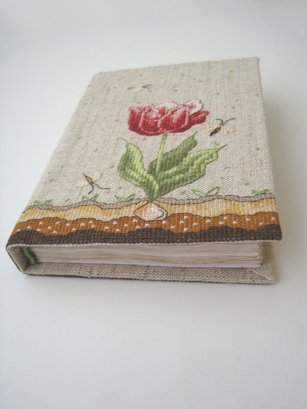 Листы тонированы в чае, а потому вышли светлее чем в прошлый раз (там тонировала в кофе и несколько раз). Книжный переплет, 96 листов, формат А6, плетеный вручную зеленый каптал, форзац в горохах. Вышивка "Spring tulip" из журнала Just Cross Stitch (April 2004). Нитки Anchor.
