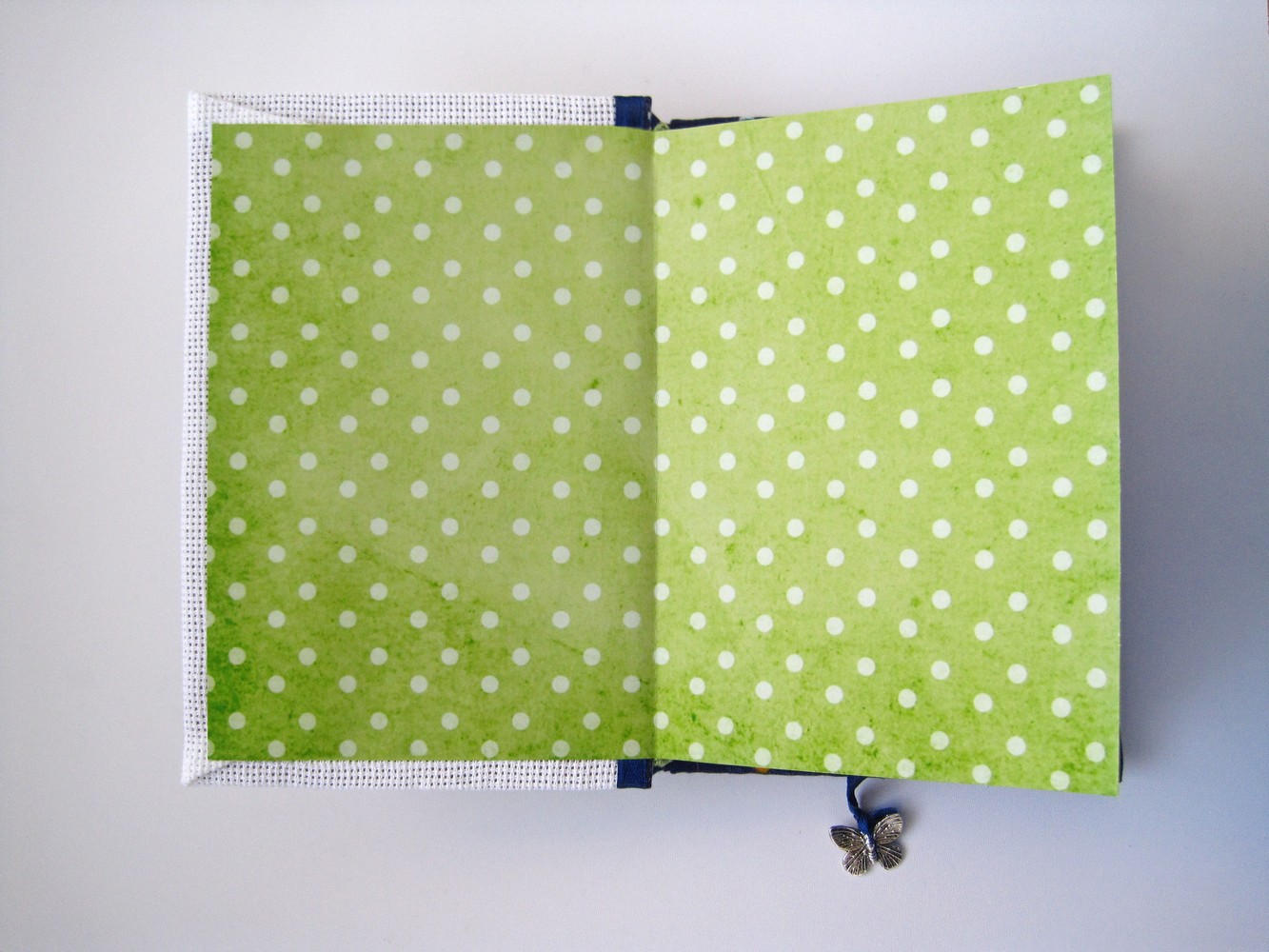 Блокнот полностью ручной работы, формат А6, книжный переплет, 78 листов нелинованной офисной бумаги фиолетового цвета, плетеный каптал, форзац в горохах и закладка с шармиком-бабочкой, обложка мягкая, на синтепоне. Корешок закреплен тремя белыми брадсами. Вышивки из журнала Zweigart № 212, нитки Anchor.