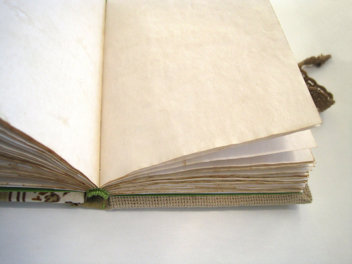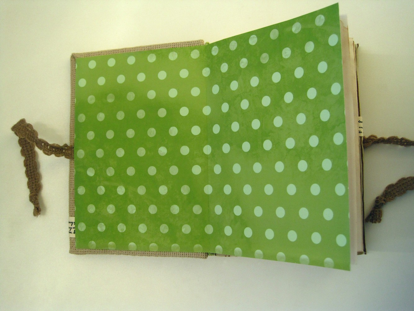 Блокнот, как обычно, сделан с нуля, весь ручной работы. Формат А6, книжный переплет, 78 листов нелинованной офисной бумаги тонированной в кофе, плетеный каптал, форзац в горохах и мягкая обложка за счет слоя синтепона. Корешок закреплен двумя белыми брадсами. Завязка из коричневого хлопкового кружева. Вышивка - нитки Anchor.