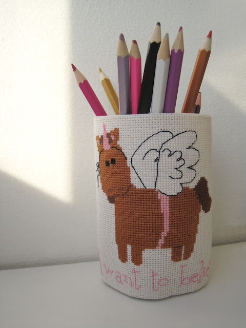 Карандашница сделана по тому же принципу что и все предыдущие. Когда-то, уже и не помню где, когда только начинала вышивать, купила пол метра канвы, неопределенного молочного цвета. Но она оказалась неравномерной. Использую ее теперь по чуть-чуть на всякую мелочь, где не критично удлинение или сплющивание рисунка. По коняшкам видно - на блокноте более длинноногая, а на карандашнице круглее =) Уже почти закончилась эта канва. Теперь то я уже умная :) и всегда обращаю внимание на этот момент.