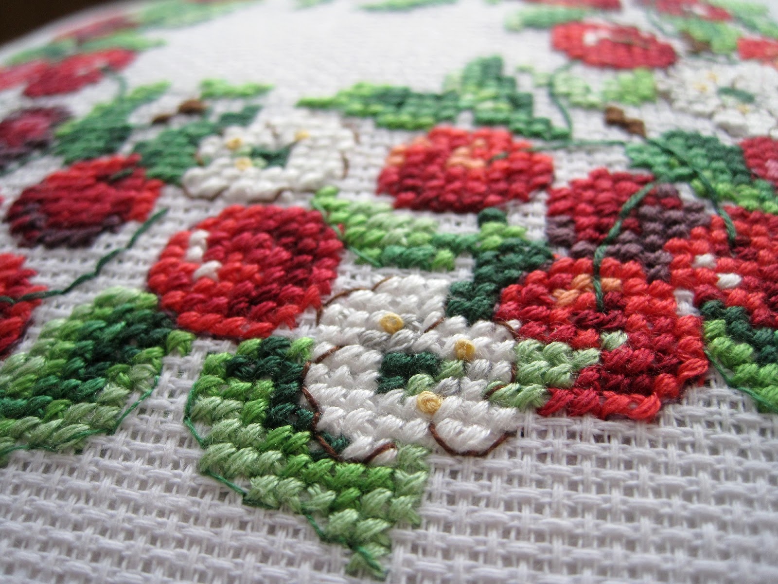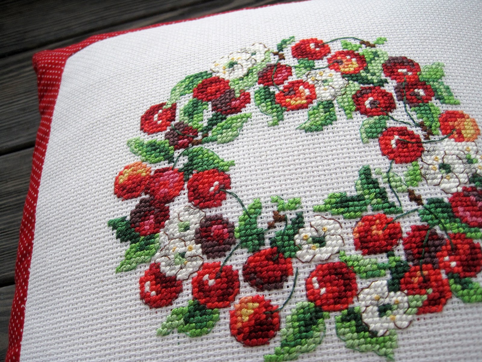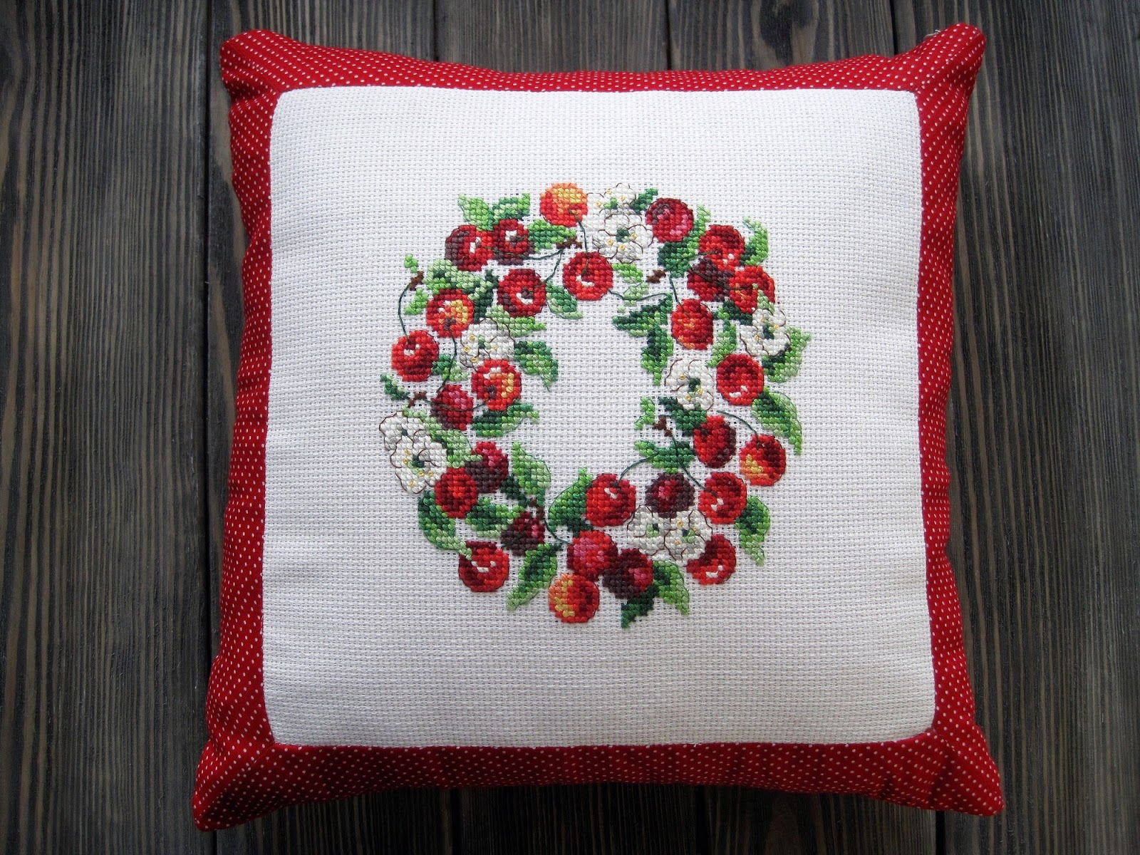 Цей вишневий вінок уже дуже давно висів у моїх хочушках. Та все не знала, куди я його потім діну - він виходив і не маленький, і не великий - на серветку був би в самий раз, та серветки у нас не прижились. А потім відкопала величенький клаптик канви, з якої я починала вишивати - ще не розбиралася що до чого, побачила у магазині канву і купила метр 0_о. Каунт у неї величезний, швидше за все 10 (4 хрестики на см), а отже і віночок збільшився у розмірах. Попрохала маму зробити з нього наволочку аналогічно минулій подушці. І тепер у мене на сірому дивані дві яскраві плямки :)