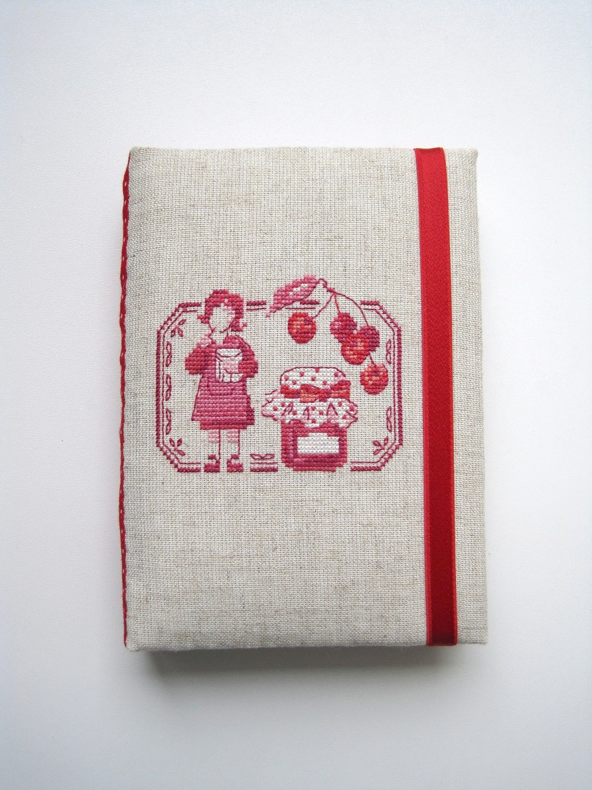 Блокнот ручної роботи зроблено з нуля. Формат А6, книжковий перепліт, 150 листів офісного білого та рожевого нелінійованого паперу, плетений червоний каптал, на корінці брадси, обкладинка м'яка завдяки шару синтепону. Вишивка з книжки Veronique Enginger "Douceurs and gourmandises au point de croix", нитки Anchor.