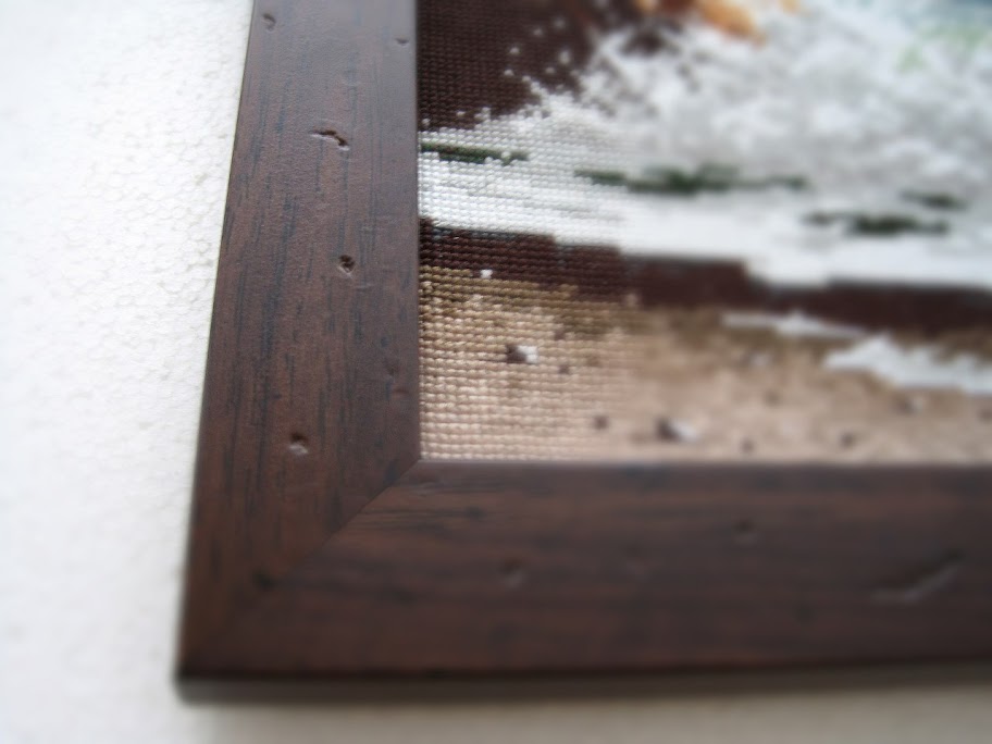 Когда планировала оформление, то в голове держался образ белого багета с загогулинами и патиной, а на месте понравился этот - под темное дерево и "грызеный" жучками. И теперь вот такой морской берег висит в нашем синем коридоре: