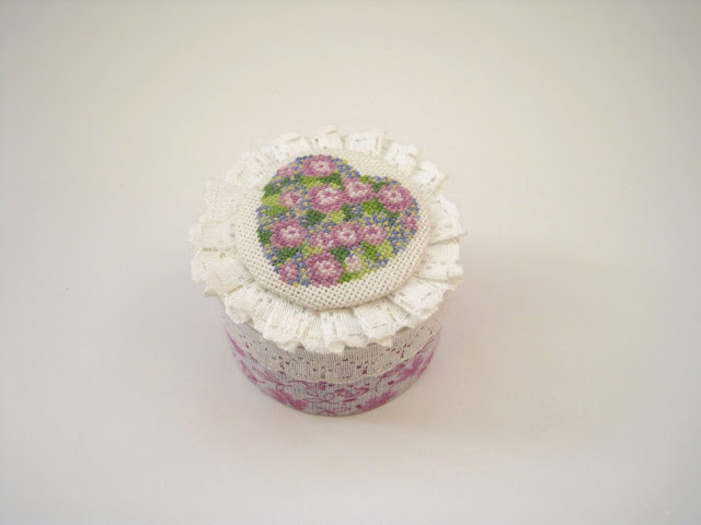 Цветочное сердечко вышила с год назад. Были на него совсем другие планы. Потом эти планы как-то не получились. А когда придумывала как оформить крышку, вспомнила что есть же у меня в загашнике оно!
