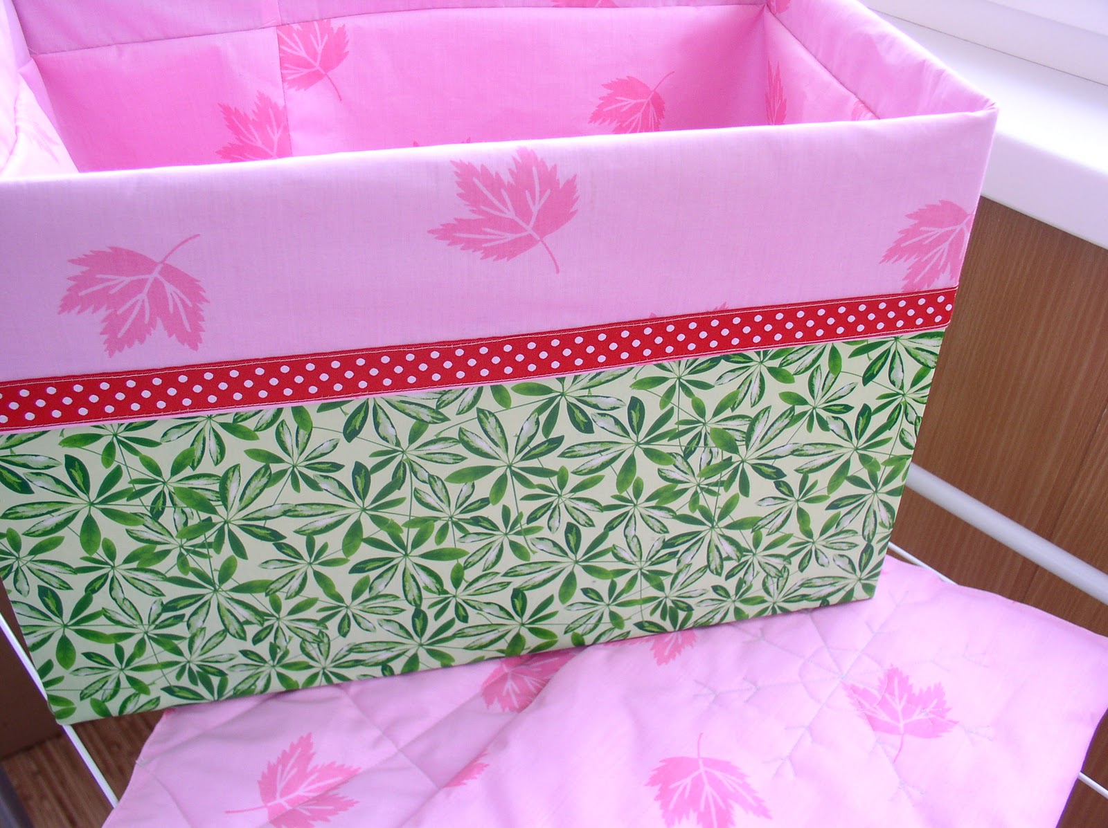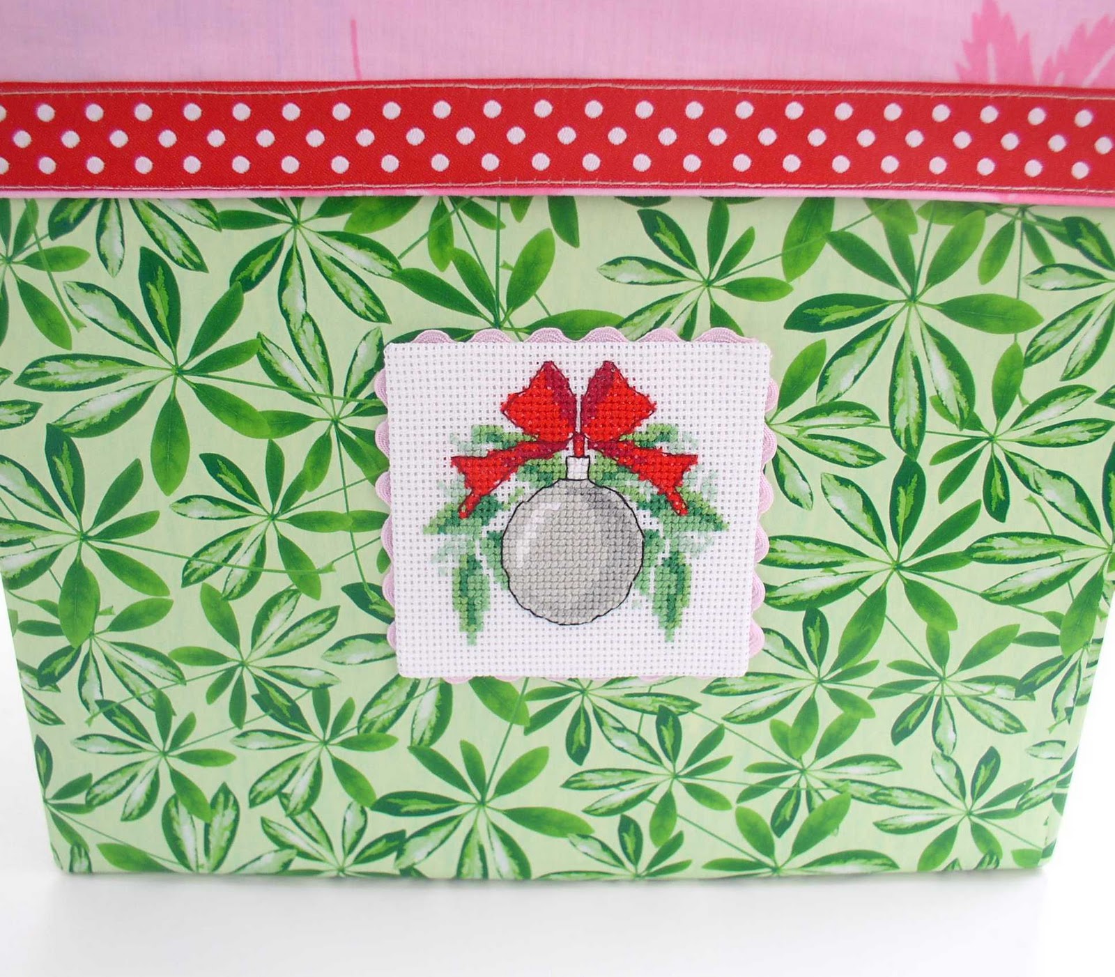 Обычная картонная коробка, оклеена оберточной бумагой (муж обозвал коноплей...) Чехол пошит из х\б ткани, по периметру пришита тасьма в горошек. Дно мягкое, с синтепоном. Из остатков ткани еще два "матрасика" пошила, тоже с синтепоном. В них, как выяснилось, большой надобности небыло, но так мне захотелось =) Служат перегородкой между рядами игрушек, чтобы не цокались друг о друга. Ну, и чтоб ни у кого не возникло сомнения что там хранится, вышивка с елочной игрушкой.